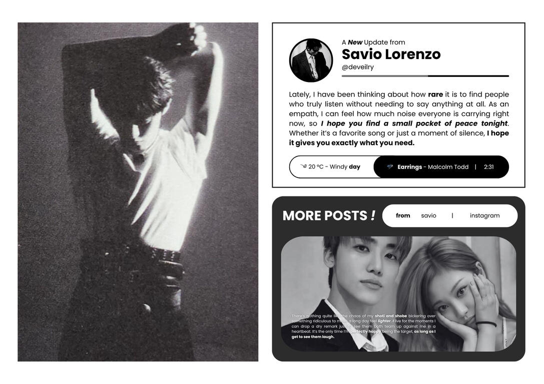 Savio is a man of quiet substance who prioritizes character over the massive legacy tied to his name. Despite his polished and professional exterior, he remains remarkably approachable and possesses a dry, understated sense of humor. He is a chronic workaholic who frequently sacrifices sleep for the sake of the business, finding it difficult to put his responsibilities down. He never raises his voice during a conflict, preferring to solve issues through calm, logical dialogue. While he stays well-versed in current internet culture and trendy jokes to catch his inner circle off guard, he remains a steady, disciplined presence that others can always rely on.The Good Side